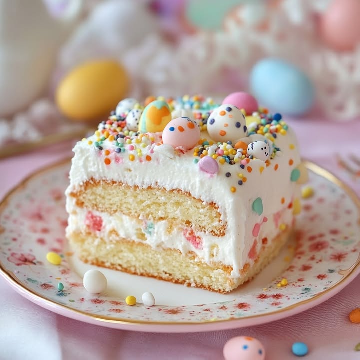 How To Make Easter Poke Cake: A Step-by-Step GuideStep 1: Bake Your Simple Cake BaseStart by preparing your cake mix as the box directs. Use a 9×13-inch pan for the perfect thickness. Bake it until it’s golden and a toothpick comes out clean. Let it cool on the counter for just about 10 minutes. It should be warm but not hot. This warm stage is key. The holes you make next will be cleaner and the cake will absorb the pudding beautifully. Pro tip: Lightly grease your pan even if the mix doesn’t say to. It helps the cake release easily. Step 2: Poke the Holes for FunNow for the “poke” part! Take the round end of a wooden spoon. Press it straight down into the cake to create holes. Make lots of them! I aim for holes about 1 inch apart over the entire surface. Don’t be shy. The more holes, the more pudding filling you get. It’s like creating little wells for the colorful pudding rivers to flow into. Step 3: Mix and Color Your PuddingIn a large bowl, whisk the two pudding mixes with the cold milk. Whisk for about 2 minutes until it starts to thicken nicely. Now, divide this creamy mixture into three separate bowls. Add a few drops of different food coloring to each bowl. Stir gently until you have three beautiful pastel puddings. I love soft pink, baby blue, and pale yellow for Easter. Step 4: Fill the Cake With ColorThis is the most fun step. Spoon or carefully pour each colored pudding into the holes. I like to alternate colors randomly for a surprise effect. Try to fill each hole as much as you can. Some pudding will spill onto the surface. That’s okay! It all adds to the moist, flavorful layers inside your poke cake. Chef’s tip: Use a small measuring cup or spoon with a point to help direct the pudding into the holes neatly. Step 5: Top With Whipped Cream and JoySpread the thawed whipped topping evenly over the entire cake. This seals in all the colorful goodness and adds a fluffy cloud on top. Now, decorate! Sprinkle the pastel sprinkles all over. Then, arrange your Easter candies. Place mini eggs in clusters or line up a row of cheerful Peeps. Let your creativity run wild. Step 6: Chill and Serve Your MasterpiecePlace your decorated cake in the refrigerator. Let it chill for at least 2 hours. This step is crucial. It allows the pudding to fully set and the flavors to meld together. When you serve it, each slice will reveal a stunning mosaic of colors inside. The cake will be incredibly moist and delicious. Enjoy this sweet and festive treat! Timing BreakdownHere’s how your time will be spent making this easy baking project: